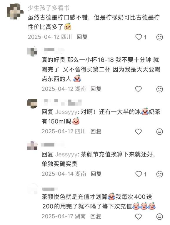 另一大问题是新品乏力。除了前文提到无法将新品推爆的问题,茶颜悦色对口味的开发也相对保守。由于此前的果茶试验风评不佳,茶颜悦色索性将实验性产品都放在鸳央咖啡、古德墨柠等子品牌和罐装零售上,本家茶颜悦色长期高度依赖口碑成熟的奶茶品类。到25年6月茶颜悦色再次尝试加入水果,仍然谨慎地在长文中对消费者不断“叠甲”。