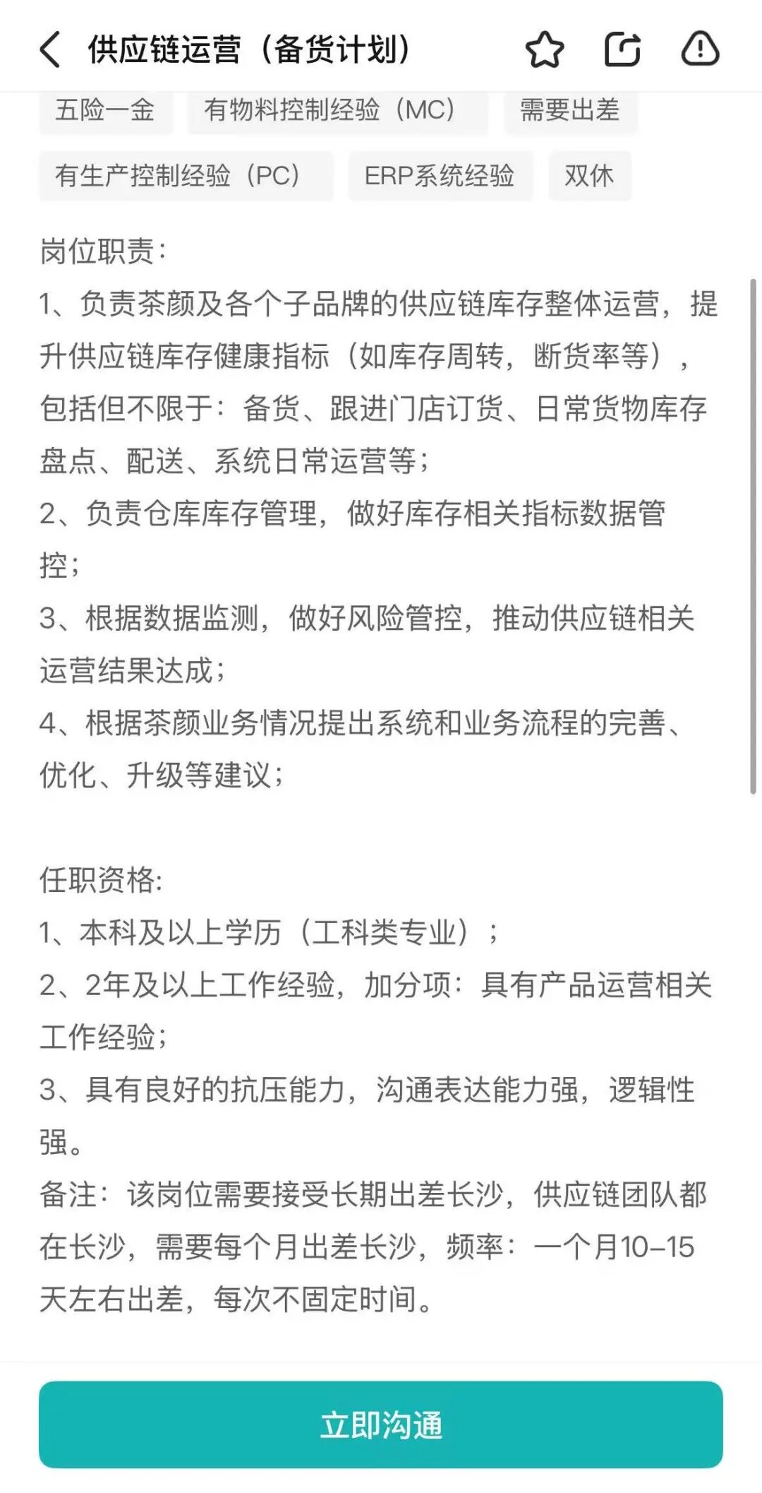 前文提到,茶颜悦色在BOSS直聘中要求深圳主管需要在长沙进行3-6个月的培训,供应链运营岗位也需要长期出差长沙与本地供应团队对接。