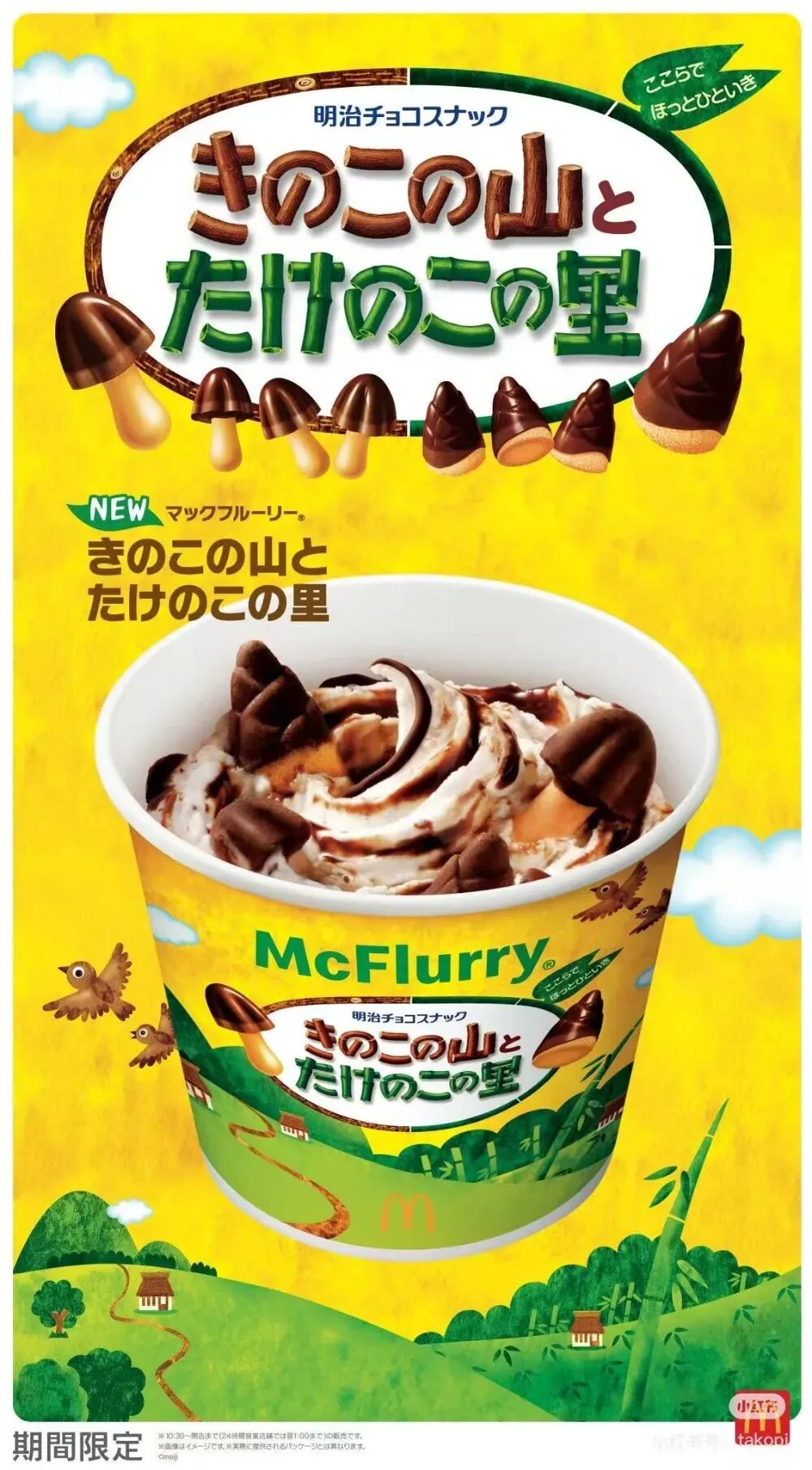 2026年1月15日,日本麦当劳宣布,自1月21日起,限时推出一款全新麦旋风产品「マックフルーリー きのこの山とたけのこの里」,直译过来,就是“麦旋风·蘑菇之山与竹笋之里”。