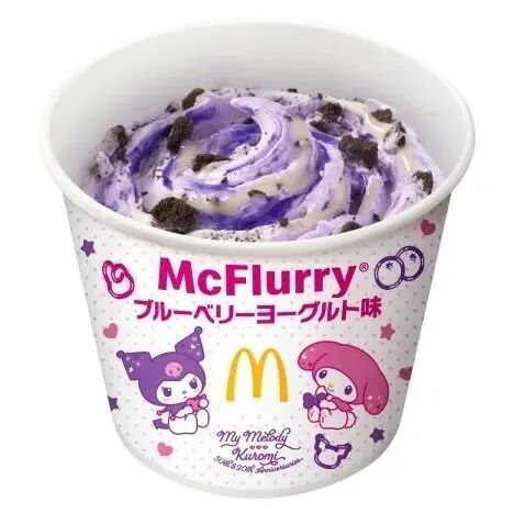 2025年9月,日本麦当劳就曾与三丽鸥人气角色库洛米(Kuromi)推出联名麦旋风。限定产品在视觉上直接呼应角色形象——麦旋风顶部覆盖标志性的紫色酱料;在口味设计上,则以细腻的软冰淇淋为基底,叠加蓝莓酱与酸奶风味酱,再搭配可可饼干碎,通过色彩与风味的组合,呈现库洛米与美乐蒂所属的角色世界。[4]