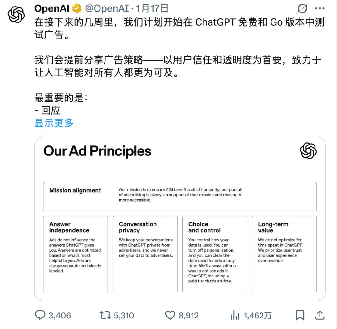 对比一下:OpenAI 2025年总收入约200亿美元,广告如果明年贡献20-40亿美元,约今年收入的10-20%,作为新业务线的起步数字相当可观。