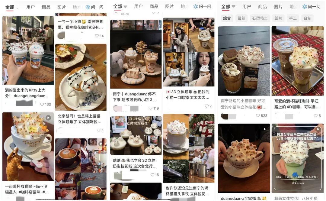 立体拉花已不再局限于简单造型。最近,上海、辽宁、广东的咖啡馆推出了进阶玩法:在杯沿用奶泡塑出数只形态各异的立体小猫,萌感十足。