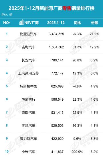 根据乘联会公布的2025年1-12月新能源厂商零售销量排行榜,比亚迪汽车以348.45万辆的累计销量稳居榜首,虽然同比下滑6.3%,但市场份额依然高达27.2%,是唯一一家销量超300万辆的车企。