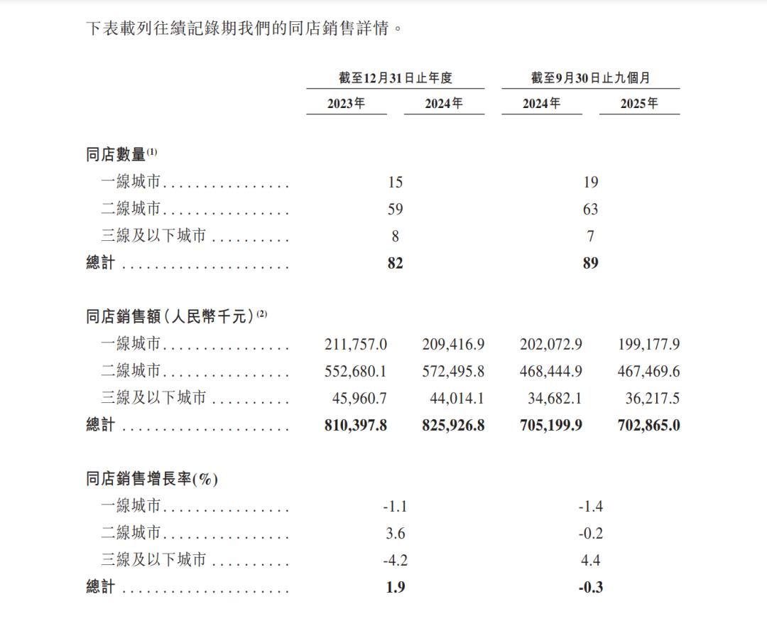 分城市线级来看,一线城市成为拖累同店销售的主要因素,2024年一线城市同店销售增长率为-1.1%,2025年前三季度降幅扩大至-1.4%,连续两个报告期录得负增长。与此同时,二线城市同店销售增长率也由正转负,2025年前三季度为-0.2%,仅三线及以下城市保持4.4%的正增长。
