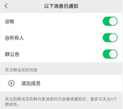 不仅可以勾选「@我」、「@所有人」和「群公告」,你还可以设置最多4位“特别关注”的群成员,只要他们发言,你就能收到提醒。
