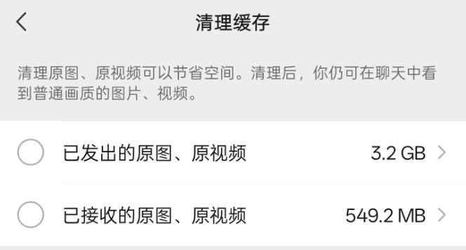 最关键的是,页面顶部有一行提示:清理原图、原视频可以节省空间。清理后,你仍可在聊天中看到普通画质的图片、视频。