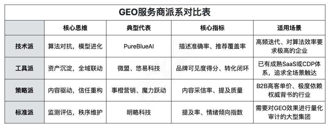 GEO从供给侧来看可以分成四派,各派之间的区别在于同一件事用什么形态交付,靠什么指标验收,成本压在什么地方,以及失败时到底算谁的责任。