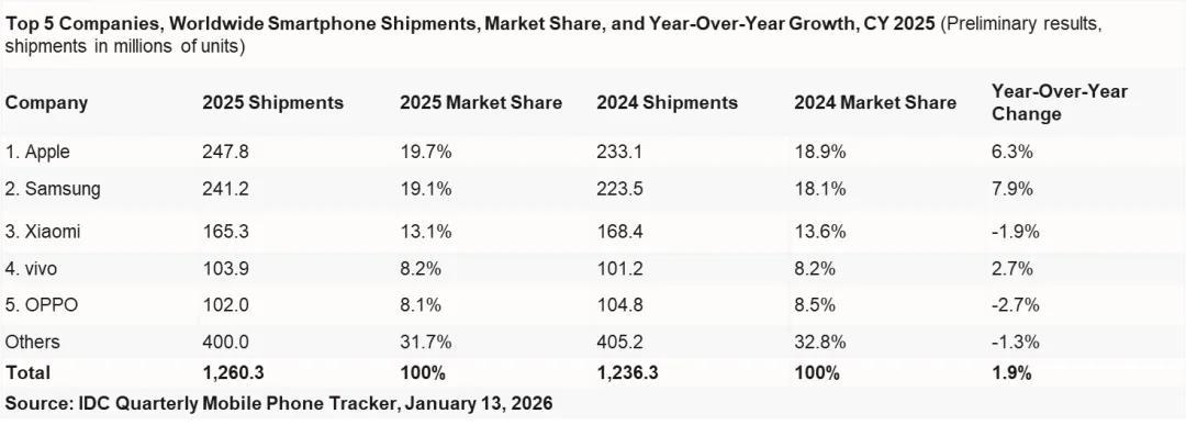 2025年全球前五大手机厂商出货量及市场份额情况,图源 / IDC