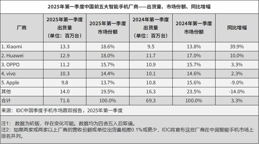 IDC的数据最能说明问题:2025年,vivo全年出货量同比跌了6.6%,是前五名里跌得最狠的;小米虽然全年微增4.3%,但第四季度直接暴跌18%,比华为跌幅还大;OPPO全年微增2.1%,变化不大。
