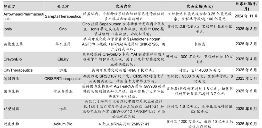 回溯其布局路径,每一步均精准踩中赛道关键节点:2019年,以97亿美元收购The Medicines Company,将全球首款靶向PCSK9的siRNA药物Leqvio收入囊中,正式叩开小核酸领域大门;2023年,斥资10亿美元收购DTxPharma,斩获Falcon脂质纳米颗粒递送平台;2025年6月,再投17亿美元收购Regulus Therapeutics,将处于III期临床的多囊肾病microRNA疗法farabursen纳入麾下,强化后期管线实力;同年9月,更是密集达成两笔重磅合作,分别与Arrowhead、中国舶望制药携手开发siRNA药物,进一步拓宽管线边界与全球布局。