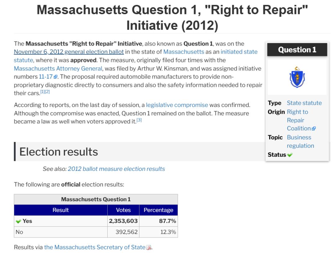 就比如 2012 年的时候美国的马萨诸塞州的民间组织维修权联盟就发起了一项提案,要求本州的车主和独立维修机构们,可以获取跟车企售后部门一样的车辆诊断和维修信息。