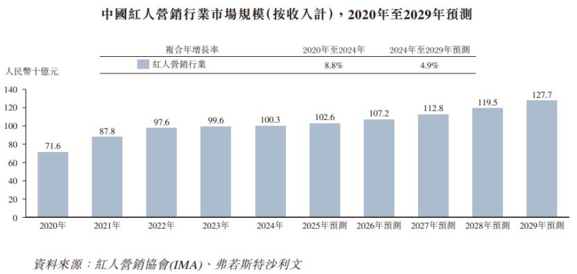 2024年中国红人经济规模约1.38万亿元,预计到2029年将扩大至2.11万亿元,2024年至2029年的复合年增长率为8.8%。