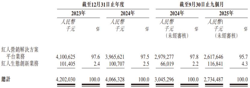 天下秀的收入主要来自红人营销解决方案平台,2023年、2024年、2025年1-9月(简称“报告期”),该业务为公司贡献了95%以上的收入,还有小部分收入来自红人生态创新业务。