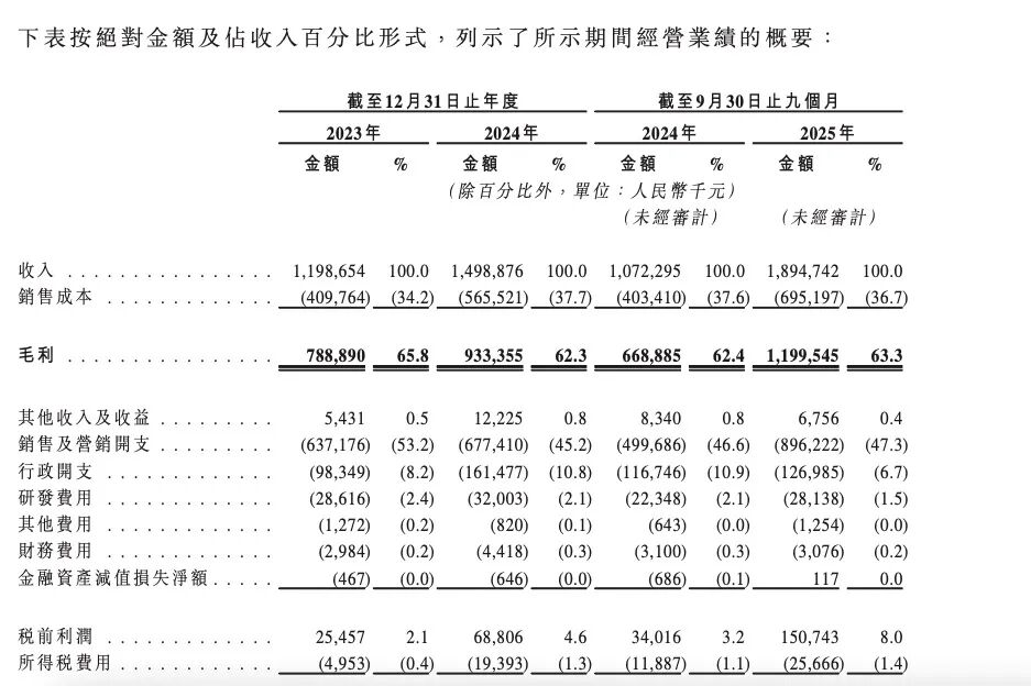 公司销售及营销开支在2023年至2024年及2025年前三季分别为6.37亿元、6.77亿元和8.96亿元,占总收入的比例分别高达53.2%、45.2%和47.3%,占比近半。