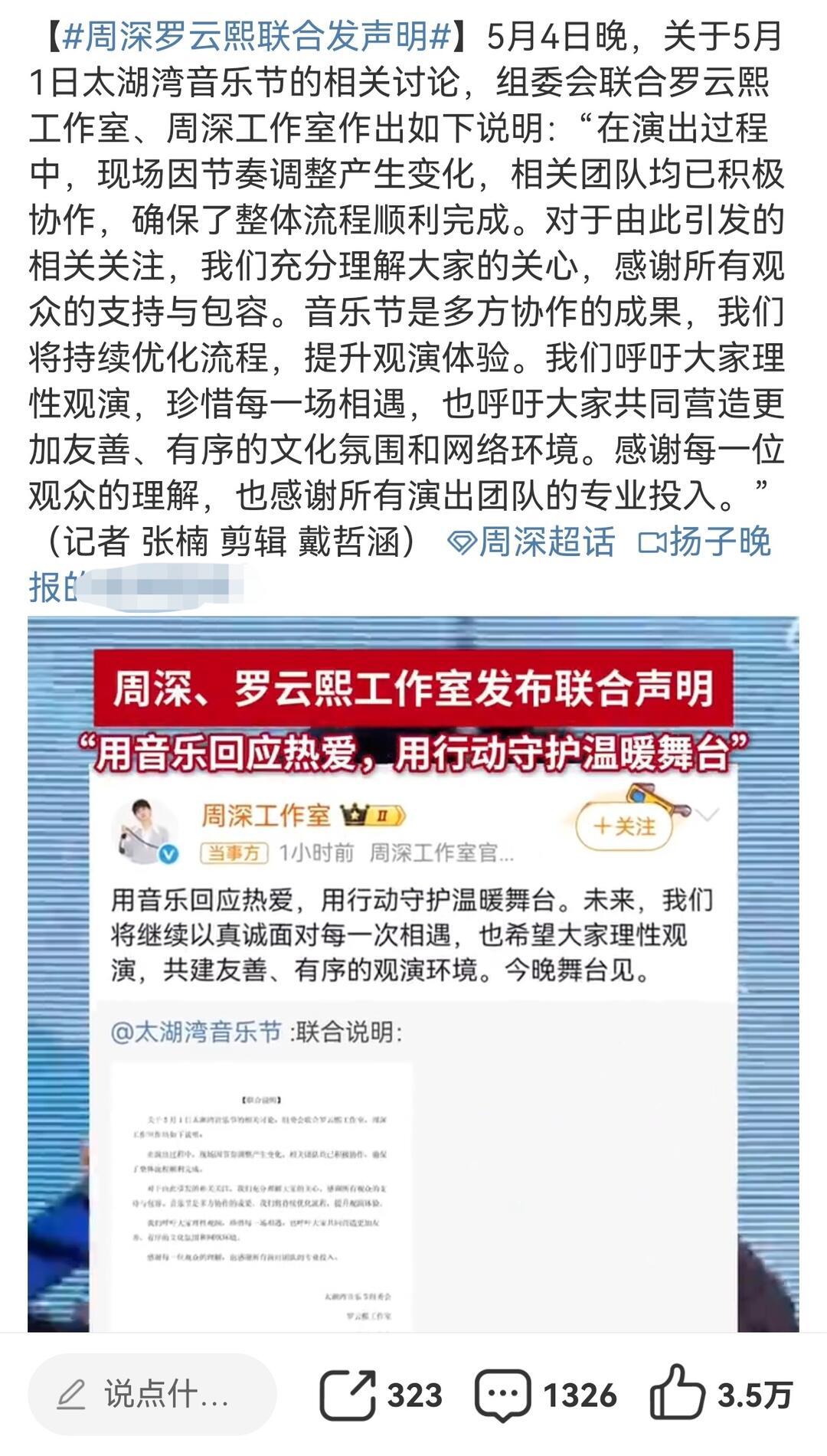 当一场音乐节请来两个及其以上的流量艺人,前排就成了“兵家必争之地”,免不了一番“友好交流”。今年五一太湖湾音乐节线下,罗云熙和周深粉丝因为抢夺前排,骂战一触即发,双方粉丝各执一词,最后太湖湾音乐节组委会不得不联合罗云熙工作室与周深工作室发布声明。