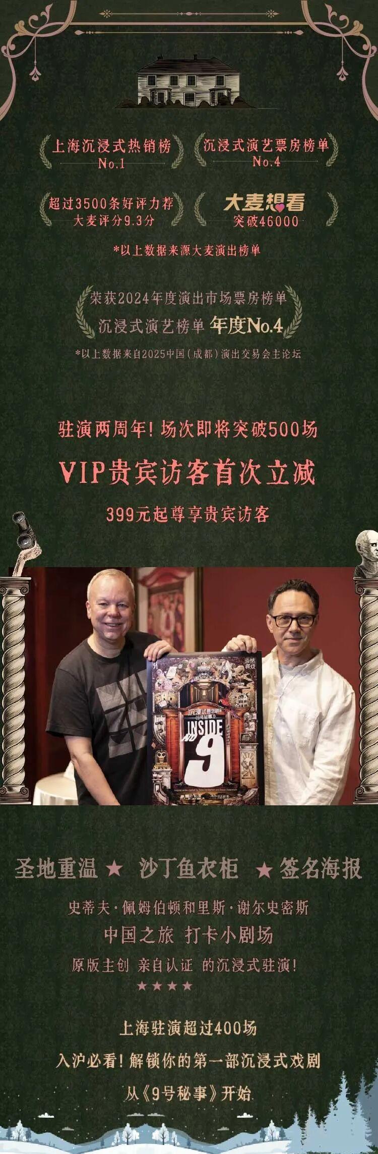 沉浸式悬念剧场《9号秘事》作为该IP全球首个线下版本,自2023年底登陆上海后已演出近300场,长期霸榜当地热销榜。2025年,该IP也推出了北京城市限定版,未来,这一爆款剧目有望将观演热潮带到更多城市。