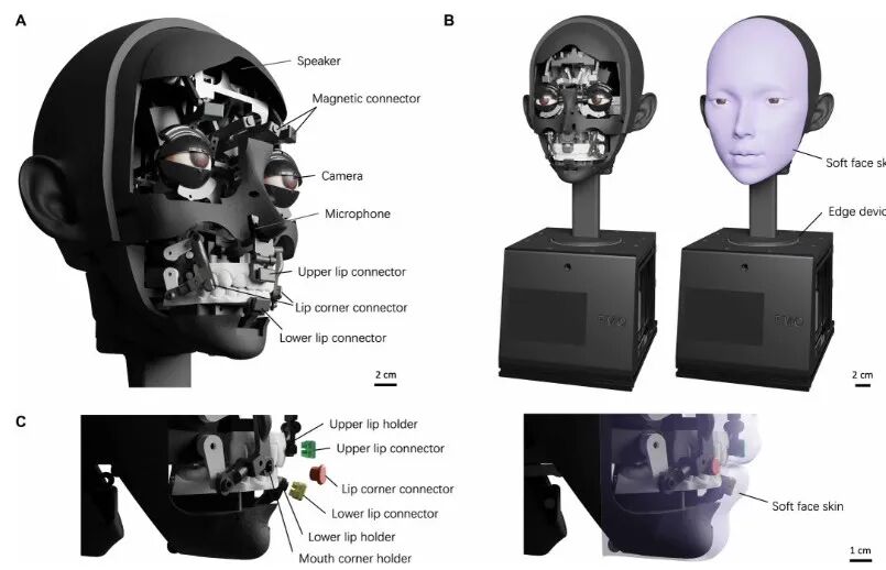 人脸机器人的结构和人脸类似,具有外层皮肤——硅胶人皮、中间层的骨骼和控制表情的神经中枢大脑,为了让方承意更加拟人,首形科技在不同层面都做出了创新。在机械脸的骨头,首形科技给机器人的面部装入三十块可动肌肉单元在眉毛、眼睑、眼球、嘴角、下颌各处,各有独立控制,能做不对称的小表情,用来模拟人脸的肌肉单元;首形科技采用的硅胶皮肤可以把它想成“磁吸手机壳”,卡扣一按就贴合硬件骨架,方便更换与维护,也让皮肤弹性和细节更接近真人。