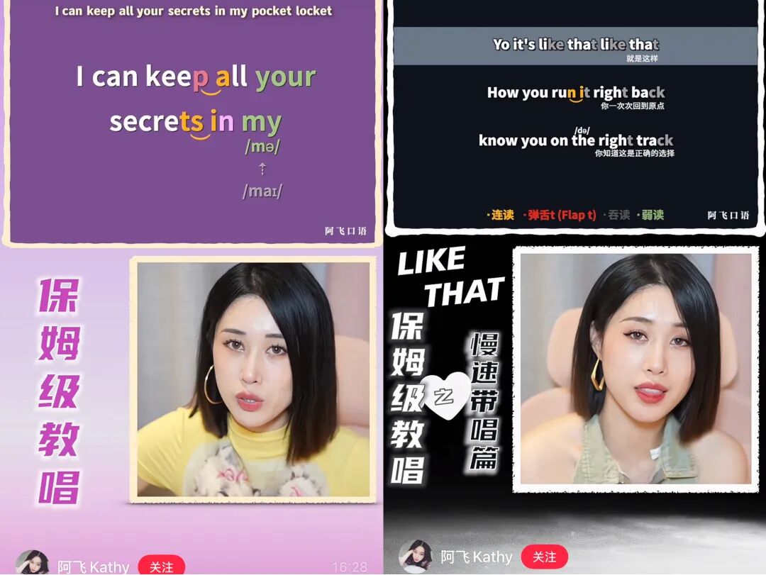 这一时期的典型账号还有@阿飞Kathy,主打英语/韩语歌曲的保姆级教唱,不但会带用户逐条分析歌词,条分缕析每一处疑难杂词,还会剖析其后的发音方式,让用户更透彻地理解英文歌唱法与发音,一条视频长达30分钟。