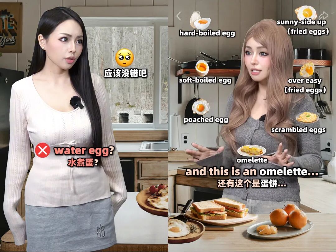 这一系列中,金发美国女孩和黑发留学生是标准搭配,黑发留学生常因用错单词导致词不达意,金发女孩则会对其说法表示诧异,带着“谁让我宠你呢”的表情为她纠错,一门心思就是“教”:水煮蛋用water egg?nonono,我们这里有hard-boiled egg、soft-boiled egg、poached egg、fried egg、scrambled eggs、omeltte,记得不要把yolk(蛋黄)说成egg yellow……在极强的戏剧性中,知识就这样丝滑地进入观众的大脑。