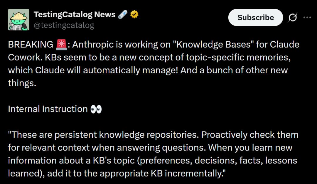 就在今天,消息人士爆出:Anthropic正在给Claude Cowork重磅升级,知识库注入永久记忆!