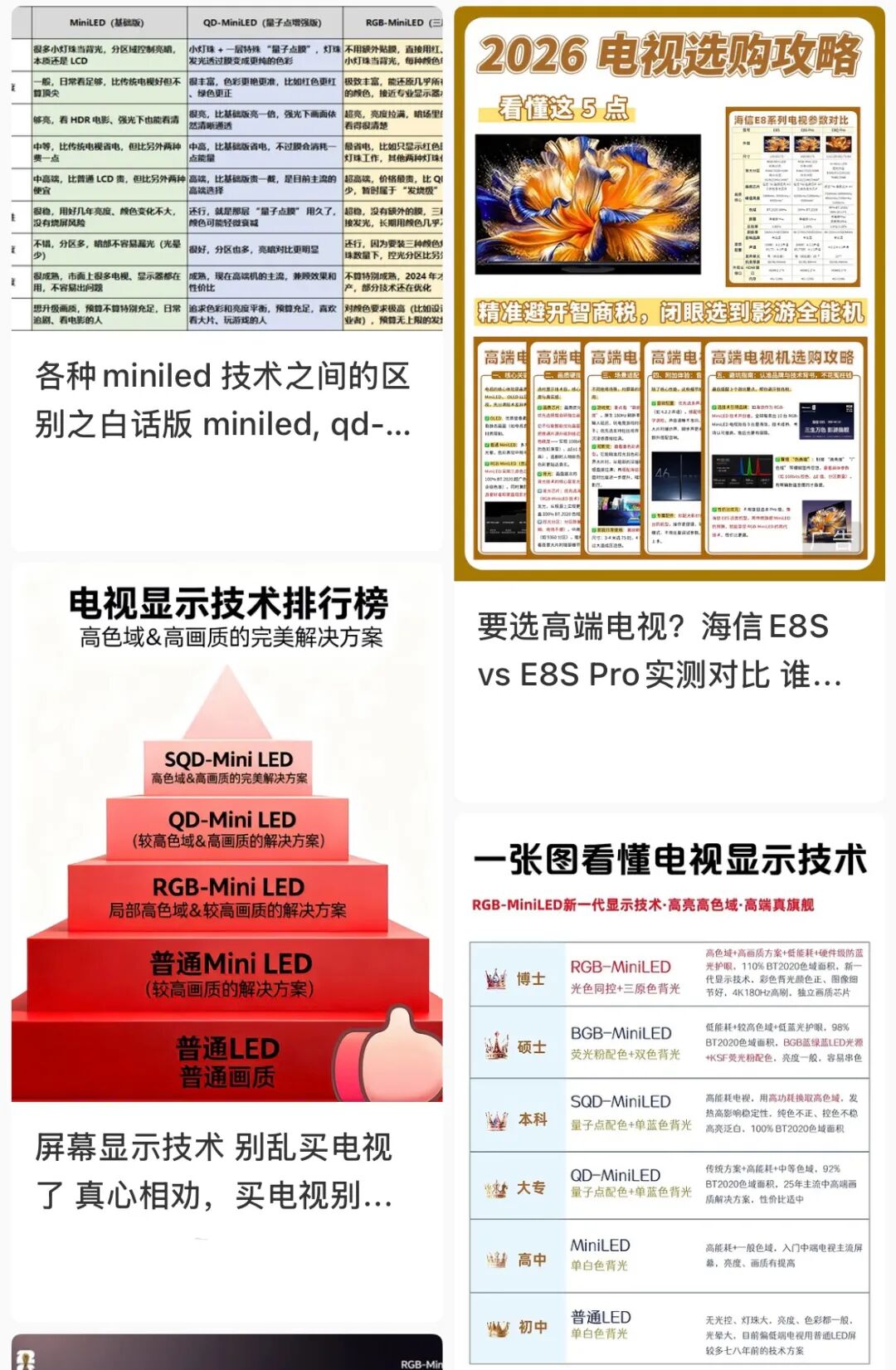 打开小红书等社媒平台,以“LED”“RGB-Mini LED”为关键词检索,会弹出各种“金字塔”“倒金字塔”等排行榜,有大量博主介绍LED及相关技术,各种榜单让人眼花缭乱。