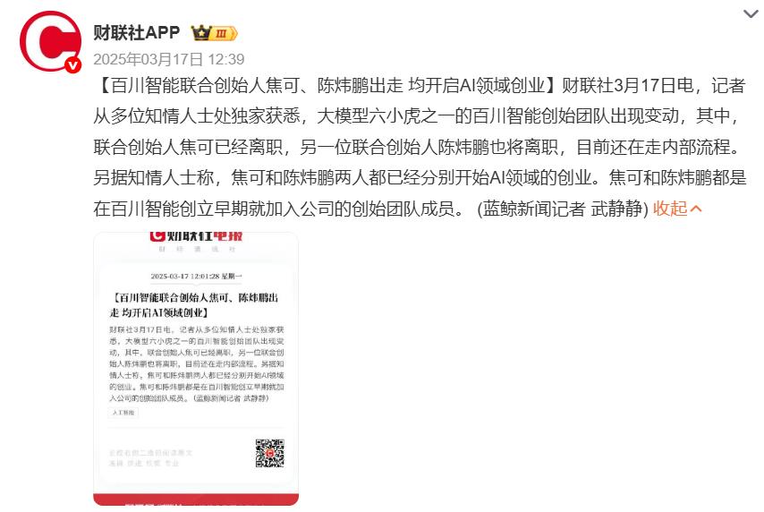 早在2024年,王小川就曾表示百川智能的业务重心将转向医疗领域。2025年初,百川智能将B端组的PE(提示词工程)团队调整至产研组,裁撤了主要负责金融行业ToB业务的B端组。随后,公司的联合创始人陆续出走,只剩下茹立云管理医疗To B团队,这也被外界视为百川智能要坚定押注AI医疗赛道的信号。