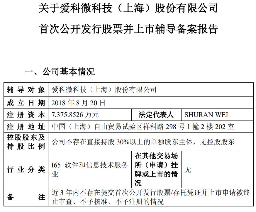 据爱科微官网介绍,公司成立于2018年,是一家专注于无线通讯领域的高尖端芯片设计公司。辅导备案报告显示,该公司不存在直接持股30%以上的单独股东主体,无控股股东。