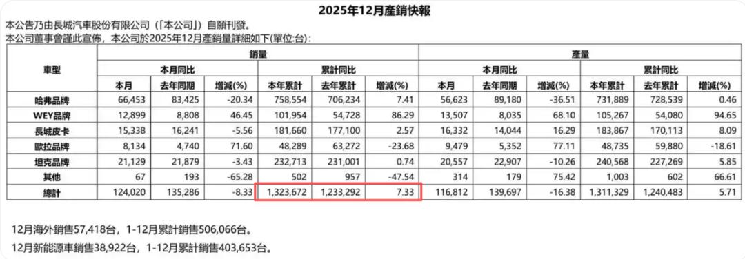 2025年全年,长城汽车累计销售汽车132.37万辆,同比增长7.33%,创下历史新高;其中新能源车型销售40.37万辆,同比增长25.44%,海外市场销量50.61万辆,同比增长11.68%,两大核心增长点均实现了突破。