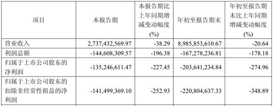 其中,第三季度营收为27.37亿元,同比下滑38.29亿元;归母净利润-1.35亿元,上年同期为1.06亿元。