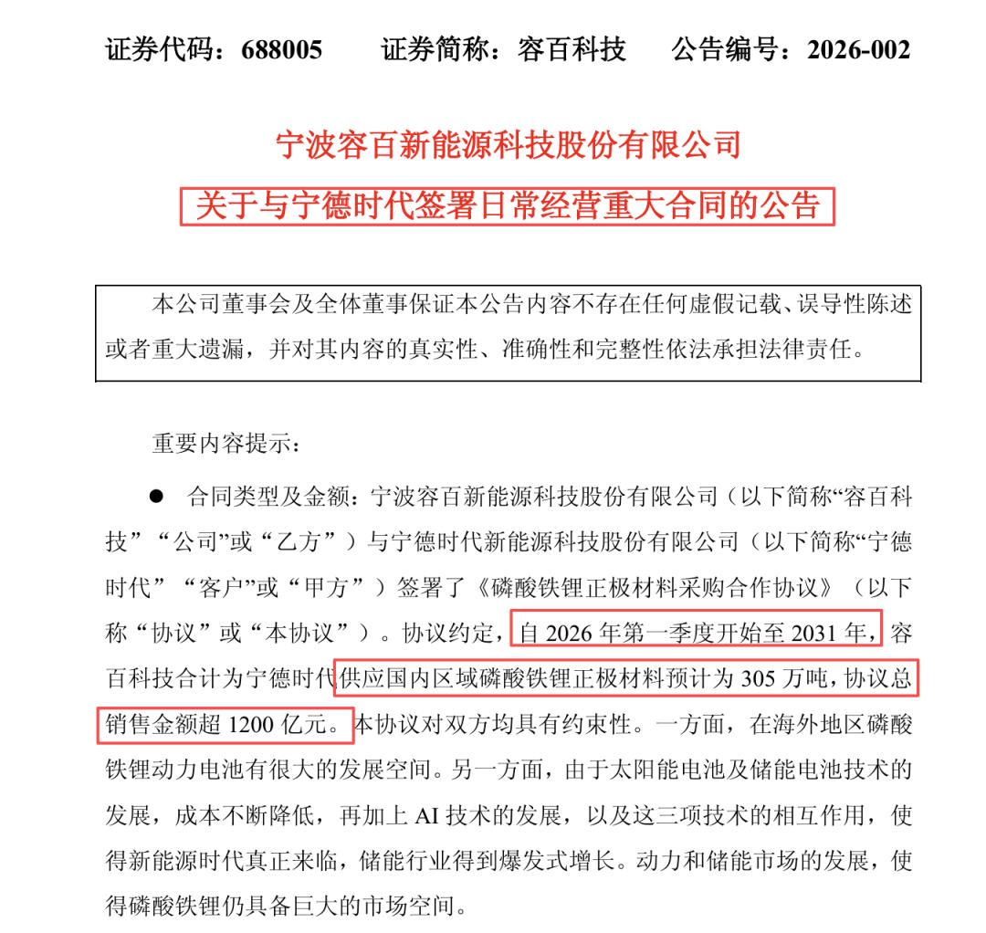 1月13日晚间,容百科技发布公告,称与宁德时代签署《磷酸铁锂正极材料采购合作协议》,约定自2026年一季度至2031年向宁德时代供应约305万吨磷酸铁锂正极材料,总销售金额“超1200亿元”。
