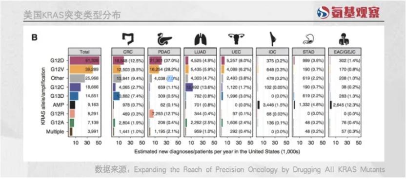 极度分裂的情况下,KRAS靶点细分子集的患者群体规模并不大。以美国市场为例。如下图所示,虽然美国每年新发肿瘤患者中,KRAS突变患者数量超过10万人。但占比最高的G12D突变,新发患者人数不过5.1万人,而像G12V、G12C等则是更少。