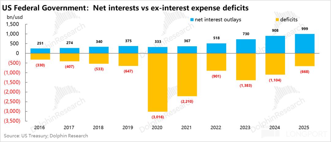 一边是双线投入,另外一边是疫情放水后刹不住的财政支出:25年1000亿的利息支出,占到了美国联邦财政支出的14%,成为了除社保开支之外的第二大支出项,超过国防开支。