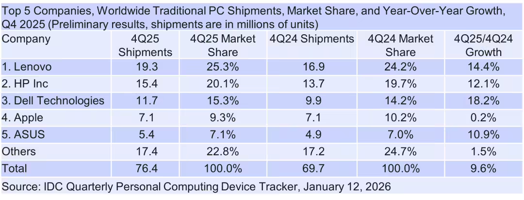 IDC 最近就接连发布了两份市场报告。一份是 2025 年第四季度全球 PC 市场报告,显示在 Windows 10 终止支持和内存短缺的背景下,戴尔和联想领跑 TOP5 厂商,出货量同比增长 18.2% 和 14.4%,与 AI 并无明显关联。