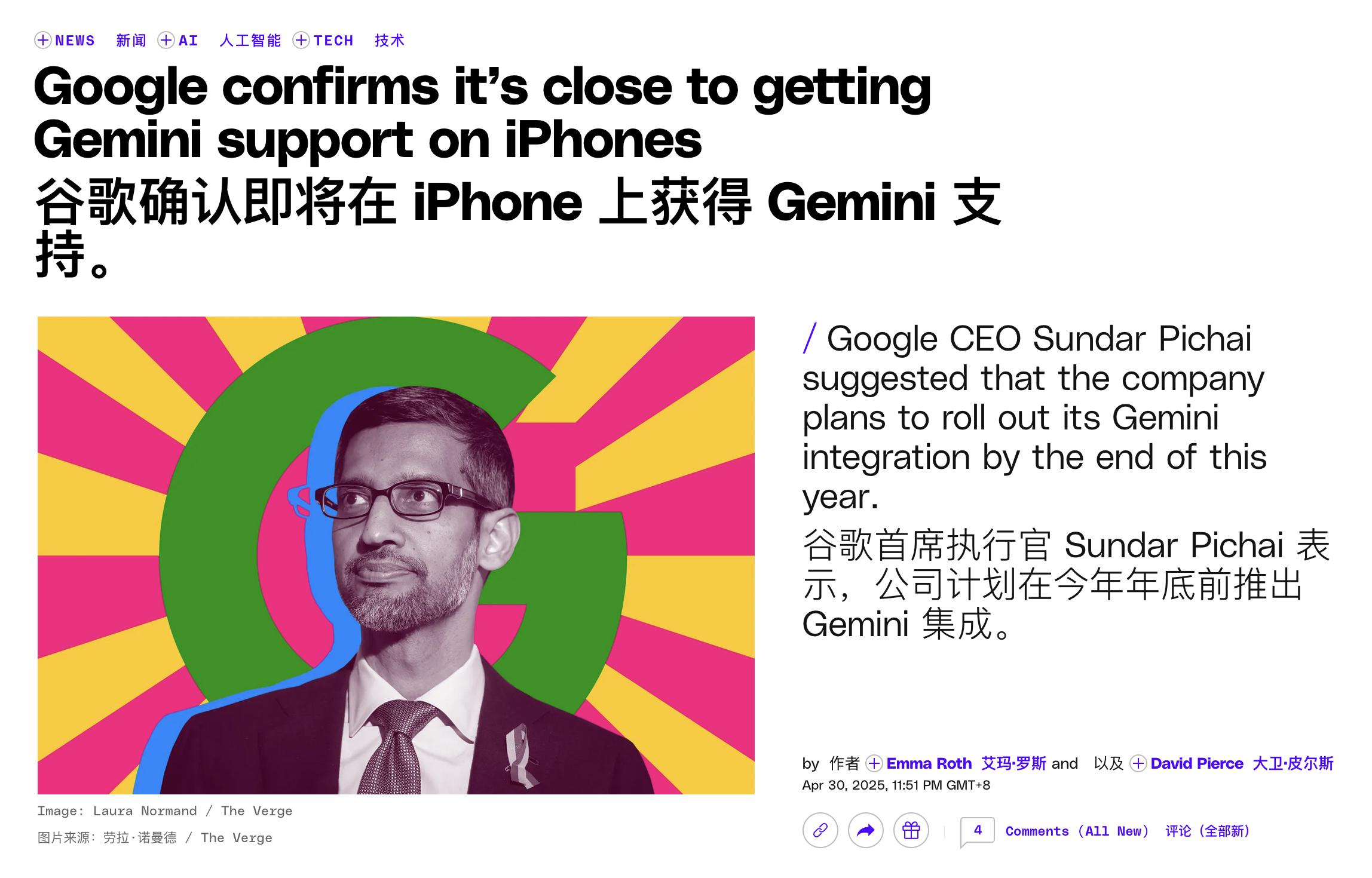 这不是简单的「加一个 Gemini 入口」或者「把 ChatGPT 换成 Gemini」。更像是苹果承认了一件现实:在短时间内扭转 AI 体验上的劣势,想靠自研模型不太现实。于是我们看到,苹果选择了在他看来最有能力的 Gemini。
