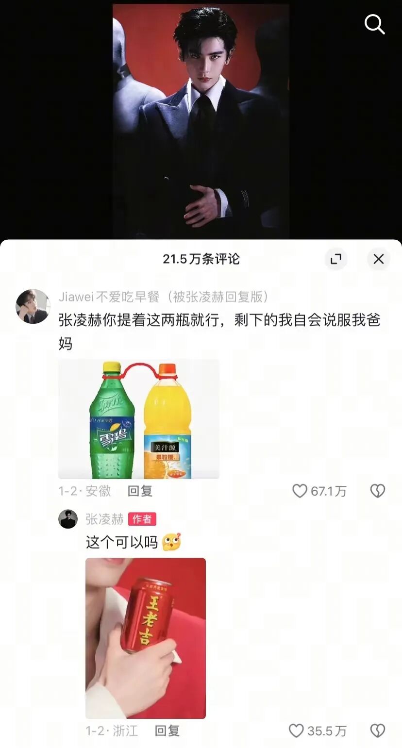 年底湖南卫视跨年晚会,首席合作伙伴王老吉的代言人张凌赫也在其现场的广告时间,为王老吉打起了广告,将新推出的“吉运好彩罐”展示在观众面前。在张凌赫走秀视频引爆全网,有网友在视频评论区配图两瓶饮料,并以文字“张凌赫提着这两瓶,剩下的我自会说服我爸妈”表达喜爱后,张凌赫以王老吉图片回复评论“这个可以吗”,引得王老吉官方和张凌赫粉丝纷纷表示有这样的代言人很放心。