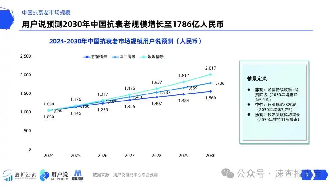 这一转变,直接推动抗衰赛道从可选消费转向刚需市场,也为一批精准切入的新兴品牌,开辟了广阔的生长土壤。用户说数据显示,中性情景下,2030年中国抗衰老市场规模预计增至1786亿元,赛道潜力可见一斑。