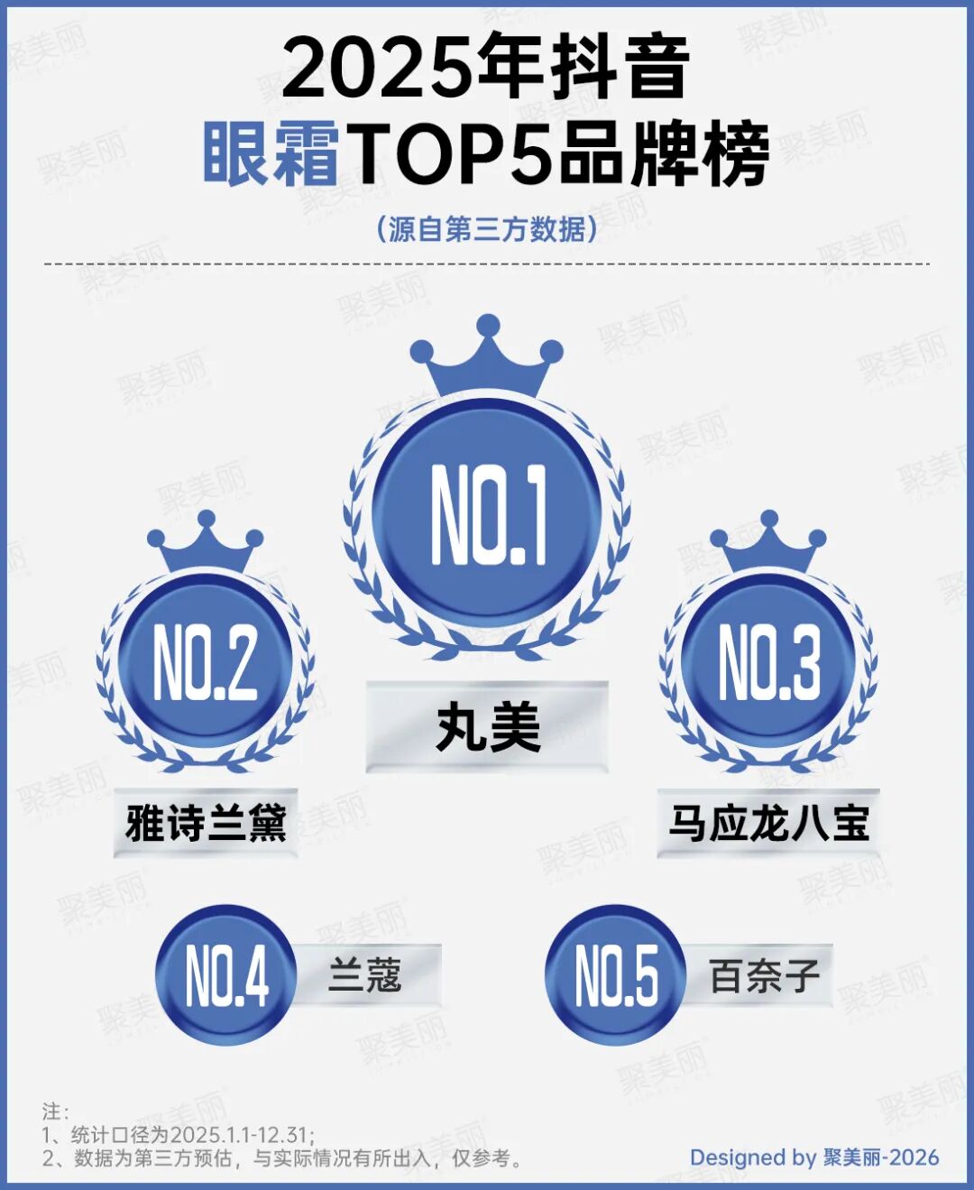 而在2025年眼霜品类TOP5榜单中,药企背景的马应龙八宝位列第三,仅次于长期深耕眼部大单品的丸美、雅诗兰黛两大头部品牌。