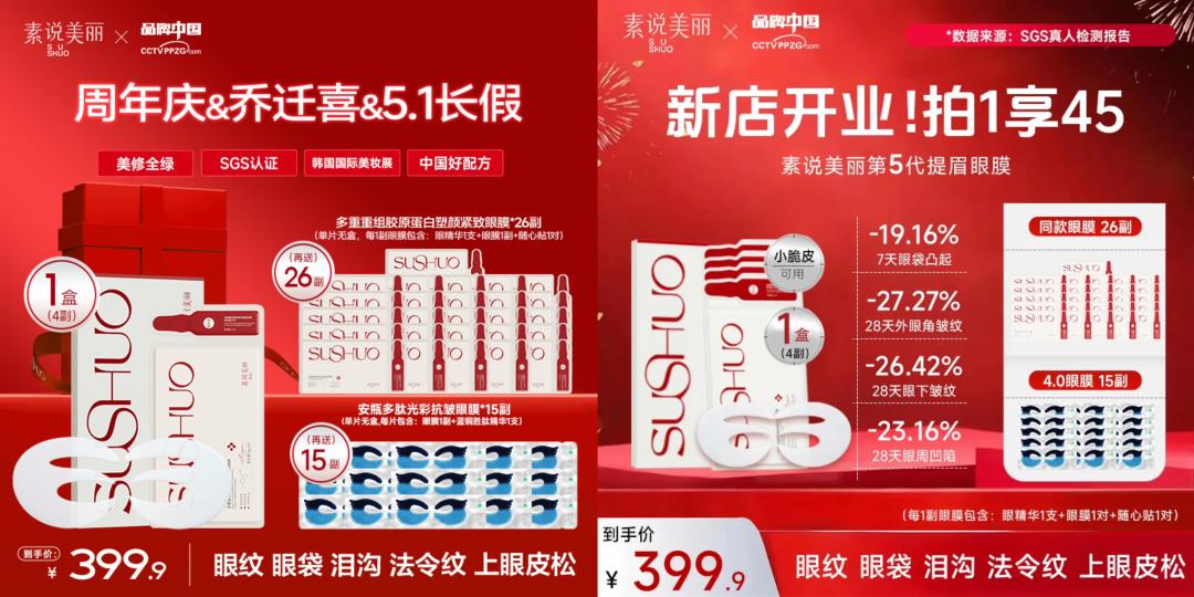 素说美丽作为抖音眼膜头部品牌,核心爆款为399.9元眼膜套组,采用“拍1发45”次抛组合策略,同步布局同价位抗衰面膜、抚纹油等。