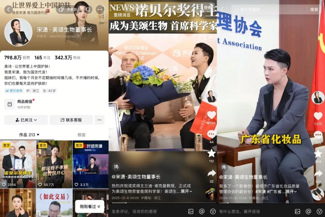 另一方面,MEICHIC美诗深耕宋潇人设价值,以农村女孩逆袭成化妆品行业掌舵人为叙事主线,叠加声称当选某地化妆品质量管理协会副会长、聘请诺贝尔奖得主担任名誉首席科学家、发布工厂溯源视频等动作,夯实品牌科学证据链。