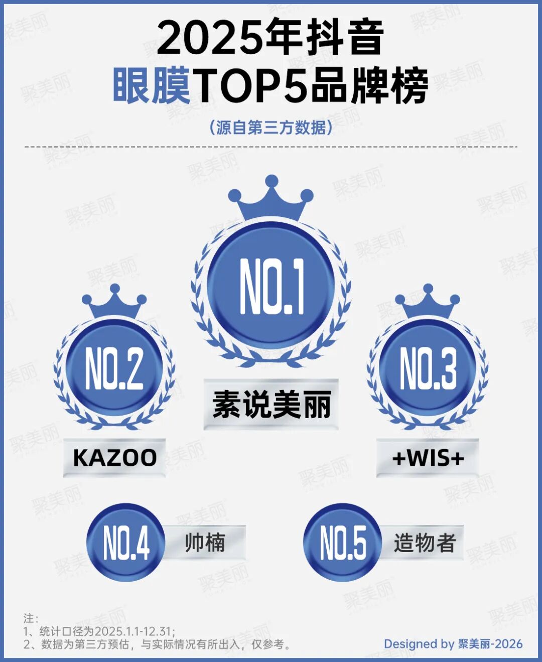 在2025年抖音眼膜TOP5品牌榜单中,早期白牌素说美丽稳居榜首,其核心爆品为售价近400元、主打保湿与紧致功效的重组胶原蛋白眼膜。而厦门海尼集团旗下护肤品牌KAZOO位列第二;同属厦门帮的头部企业跑红集团孵化的造物者则跻身第五。