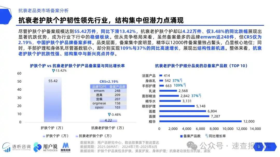 与此同时,抗衰细分品类的产品备案已迈入规模化阶段。据用户说&数说雷达研究,2024年7月-2025年6月,抗衰老精华备案数量以1.2万个高居榜首,面膜、面霜备案数分别达7287个和6804个。而抗衰面部精油、手部护理、身体乳等细分品类的备案规模亦呈现显著扩张态势。
