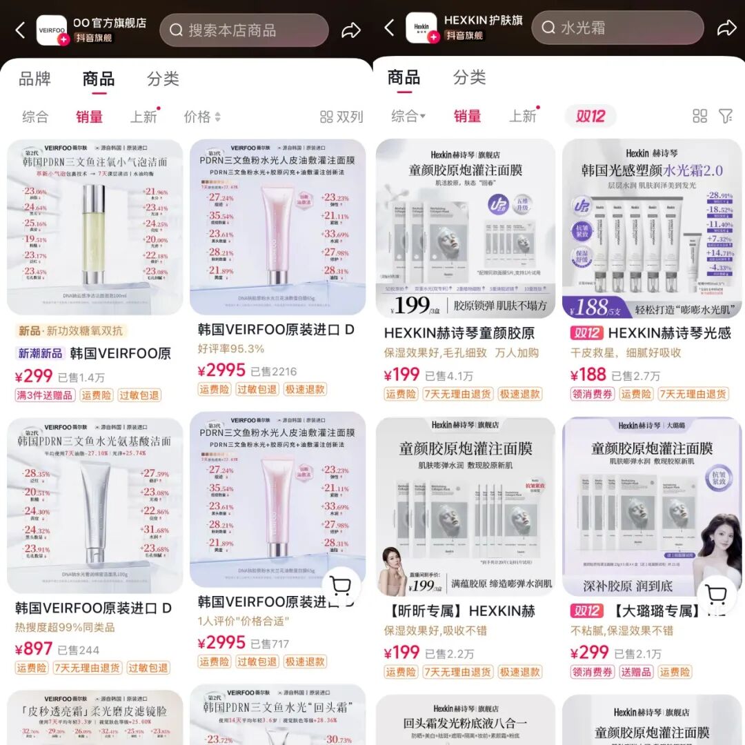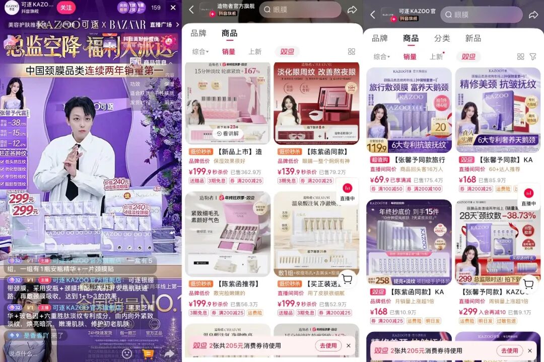 正是这一细分存在潜在需求,KAZOO等品牌直击颈纹、眼纹、黑眼圈等精细痛点;HEXKIN、VEIRFOO则通过聊播模式精准触达发达地区,且有医美术后需求的中年女性群体。