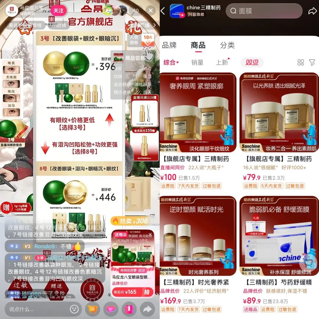 马应龙八宝与三精制药是当下眼部护肤赛道表现突出的两大药企品牌,前者依托中药护肤底蕴,后者凭借科研背书,均打造出聚焦30+人群抗皱、祛眼袋需求的百元眼霜,与国际大牌相比价格偏低或接近。二者虽坐拥药企科研优势,销售却主要依赖达播渠道。