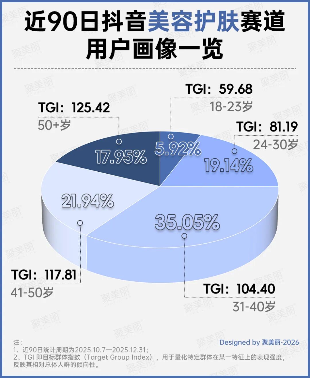 第三方数据显示,近90日(2025.10.07-12.31)抖音美容护肤赛道中,30+年龄群体的消费占比接近90%,其中31-40岁是主力军(占比高达35.05%),而24-30岁和41-50岁则各自占比约20%。