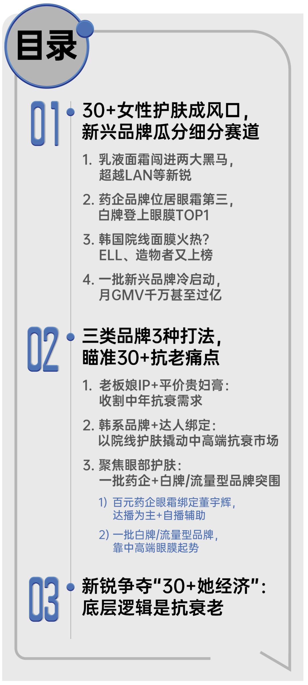 梳理这些专攻30+女性的新兴品牌,不难发现其发展路径与核心特征可归为三大破圈逻辑:1)老板娘IP+价格亲民的“贵妇爆品”+科学背书+自有工厂,通过营造农村女孩/大龄宝妈逆袭的故事突围;2)自称韩国院线护肤品牌(中高端价位+院线热门成分),往往运营/发货地在山东/广州等供应链及电商发达地区,同时捆绑明星+贵妇人设的聊播进行销售;3)聚焦眼部护肤赛道:药企品牌凭百元眼霜+董宇辉系达人出圈,厦门品牌聚焦眼纹、颈纹等痛点精准匹配产品。