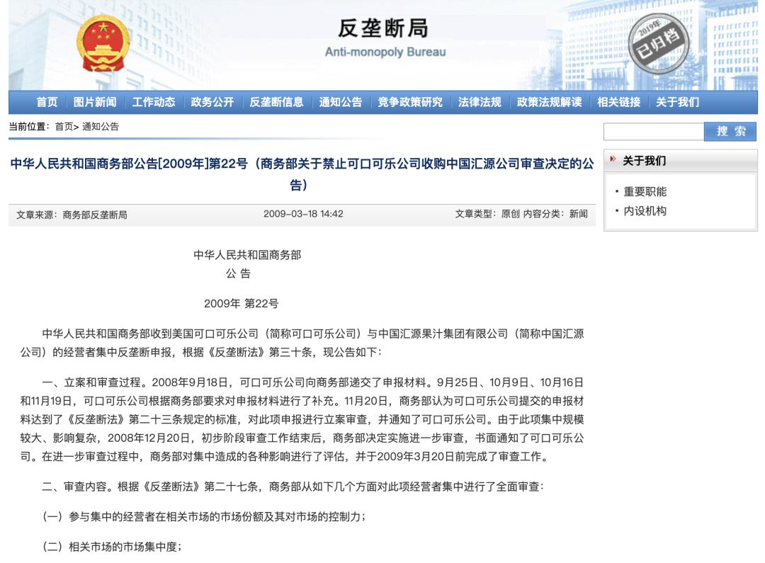 商务部禁止可口可乐收购汇源的决议 图源:反垄断局