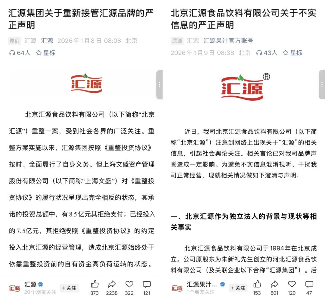1月8日,汇源集团与重整投资方文盛资产彻底撕破脸,曾经的百亿帝国,如今分裂成了两个汇源。