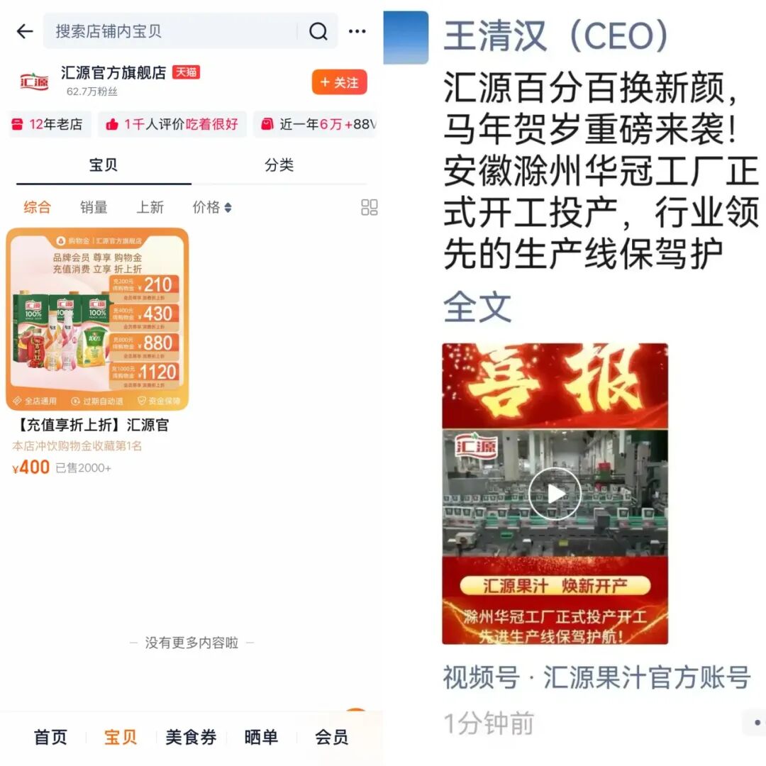 左:只有一款产品销售的汇源天猫旗舰店,右:文盛资产委派到北京汇源相关人的朋友圈,提及代工合作,图源:网络