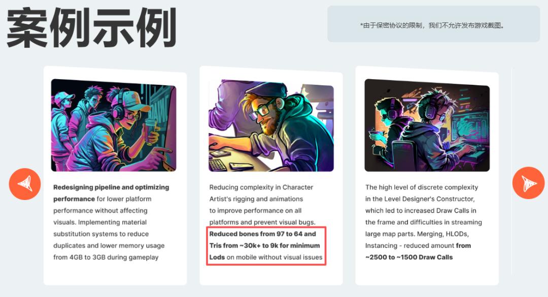 从官网了解到,他们曾成功将一款游戏的骨骼从97个优化至64个,三角形面数从约3万削减至9千,并节省了1-2毫秒的游戏线程时间,确保了在低性能平台上的流畅运行。这种深厚的技术积淀,为其日后开发自己的游戏打下了坚实基础。