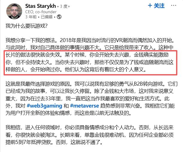 最终,他决定从B2B服务转向自主开发游戏,而数十年对游戏的热爱以及打造新型游戏体验的期待,成为了支撑这一战略转型的核心动机。他认为,无论进入哪个行业,对行业充满热情和拥有强烈的个人动机是首要条件。